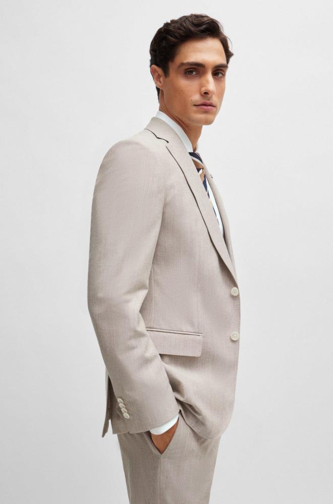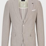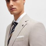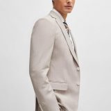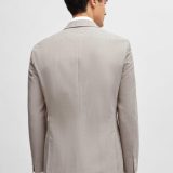 “Um casaco de abotoamento simples BOSS Menswear, de ajuste slim, em tecido com micropadrão e elasticidade para maior facilidade de movimentos. Para os nossos produtos BETTER BOSS, usamos sempre pelo menos 60% de matérias-primas melhores. Este produto é parcialmente feito com algodão reciclado. O maior volume de algodão reciclado vem de resíduos pré-consumo – por exemplo, na produção têxtil. O objetivo de utilizar materiais reciclados é poupar recursos. Este produto é fabricado com lã de origem responsável. Para nós, a origem responsável significa estar livre e cumprir os padrões das Cinco Liberdades do bem-estar animal.