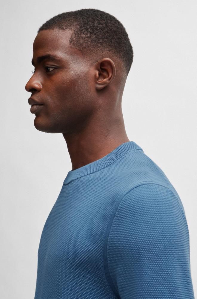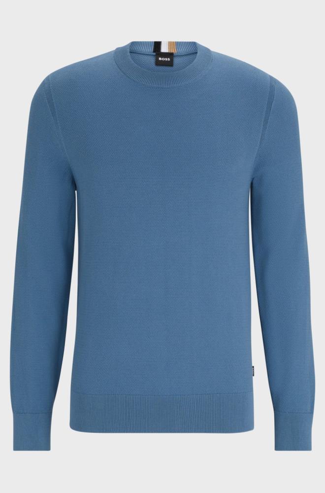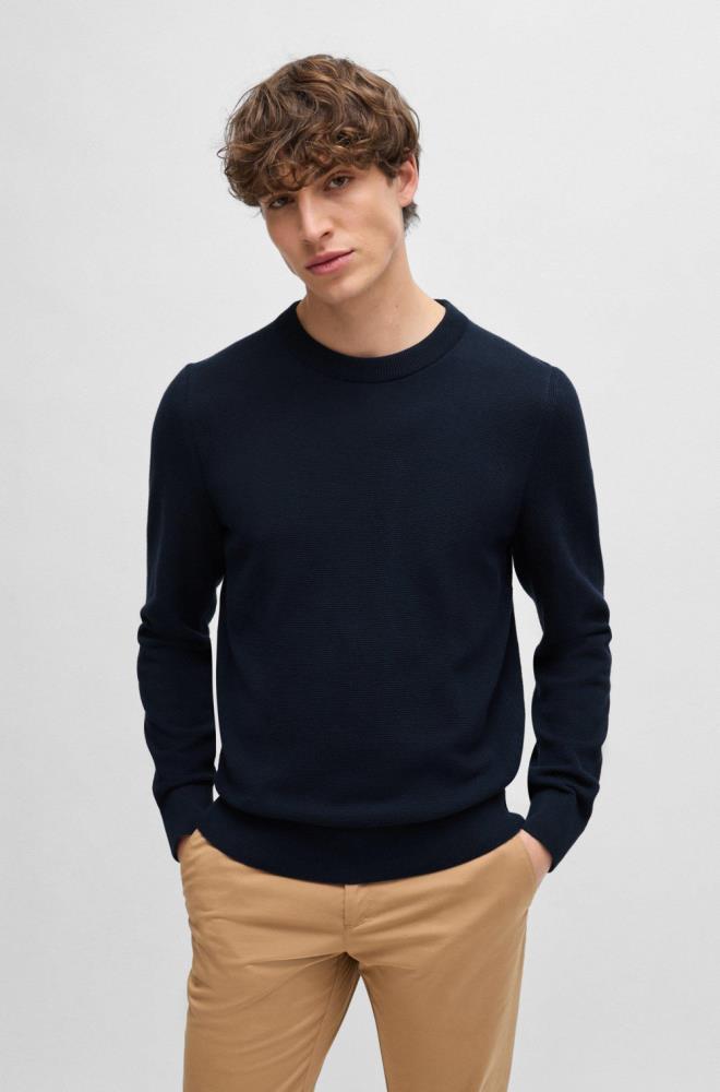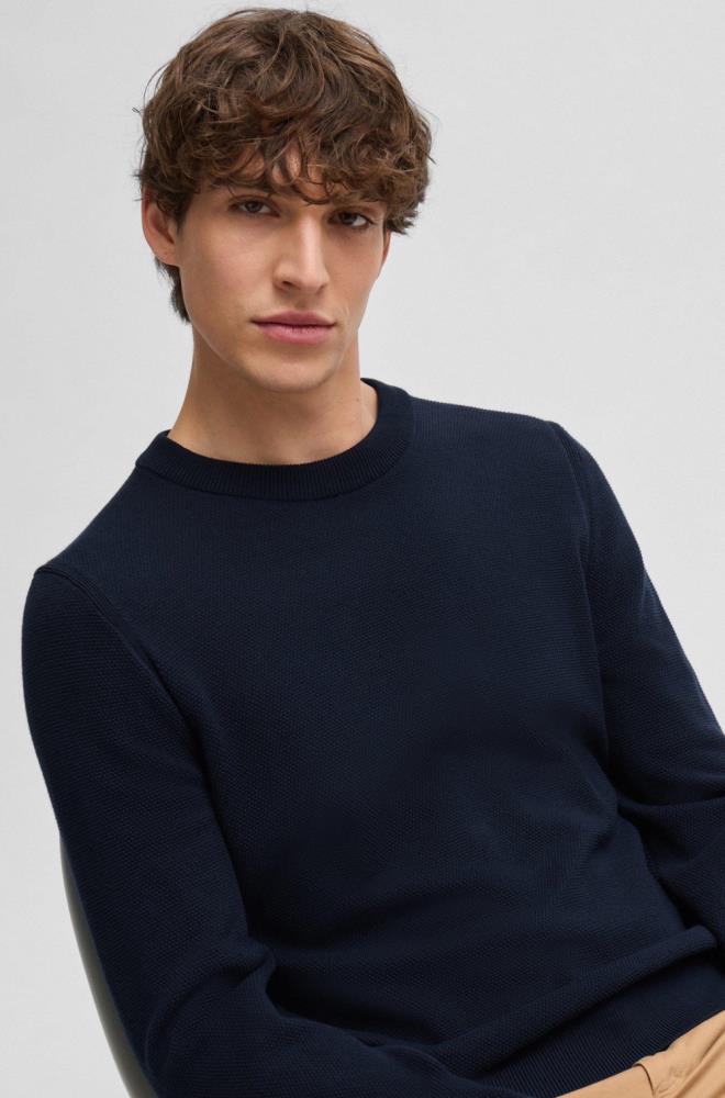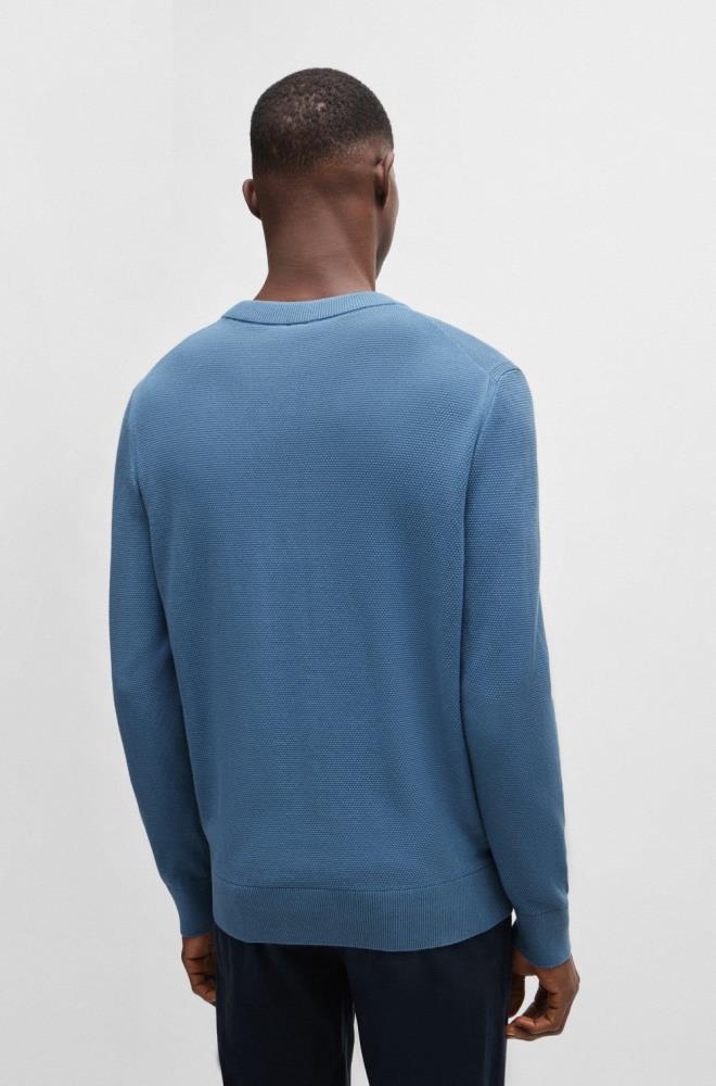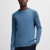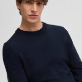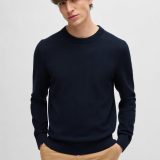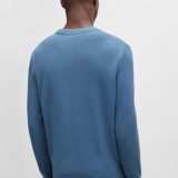 “Uma camisola de gola redonda de ajuste regular e tricotada com uma microestrutura simples BOSS Menswear. Para os nossos produtos BETTER BOSS, usamos sempre pelo menos 60% de matérias-primas melhores. Este produto é feito com algodão orgânico. As nossas normas orgânicas não permitem a utilização de fertilizantes sintéticos, pesticidas ou sementes geneticamente modificadas.” Elastano : 24%