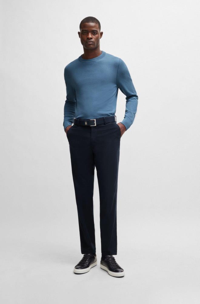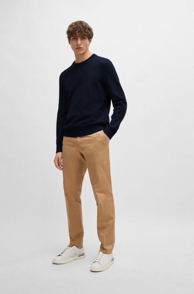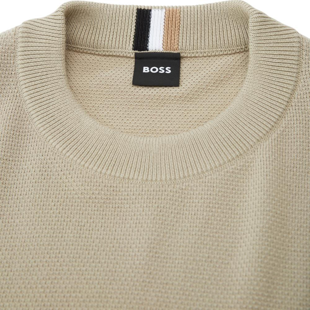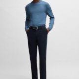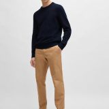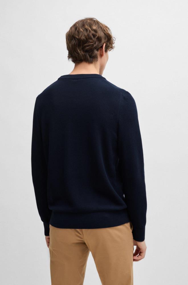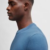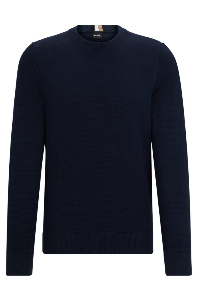 “Uma camisola de gola redonda de ajuste regular e tricotada com uma microestrutura simples BOSS Menswear. Para os nossos produtos BETTER BOSS, usamos sempre pelo menos 60% de matérias-primas melhores. Este produto é feito com algodão orgânico. As nossas normas orgânicas não permitem a utilização de fertilizantes sintéticos, pesticidas ou sementes geneticamente modificadas.” Elastano : 24%